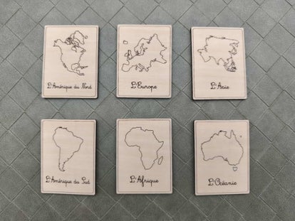 Six planches pédagogiques pour découvrir les continents, à utiliser avec les jetons et nomenclatures du même thème.