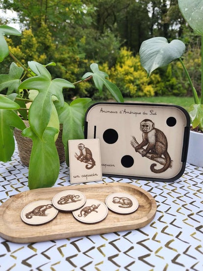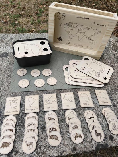 6 jetons à utiliser avec les planches mini livv du même thème et/ou les nomenclatures bois qui se composent d'un jeton représentant le continent (identique à la planche et la nomenclature) et 5 jetons animaux.
