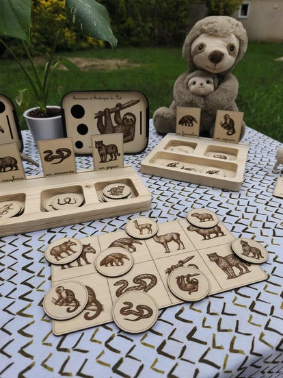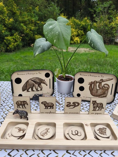 -> Certains animaux vivent dans plusieurs régions, comme par exemple le paresseux, qui se trouve en Amérique du sud mais aussi en Amérique centrale (qui fait partie du continent nord américain). Pour simplifier les ateliers avec les enfants, les jetons représentant ces animaux font partie de la catégorie "Amérique du Sud".