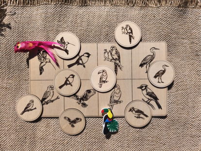 Une planche de huit case à l'effigie des oiseaux de nos jardins, et ses huit jetons.