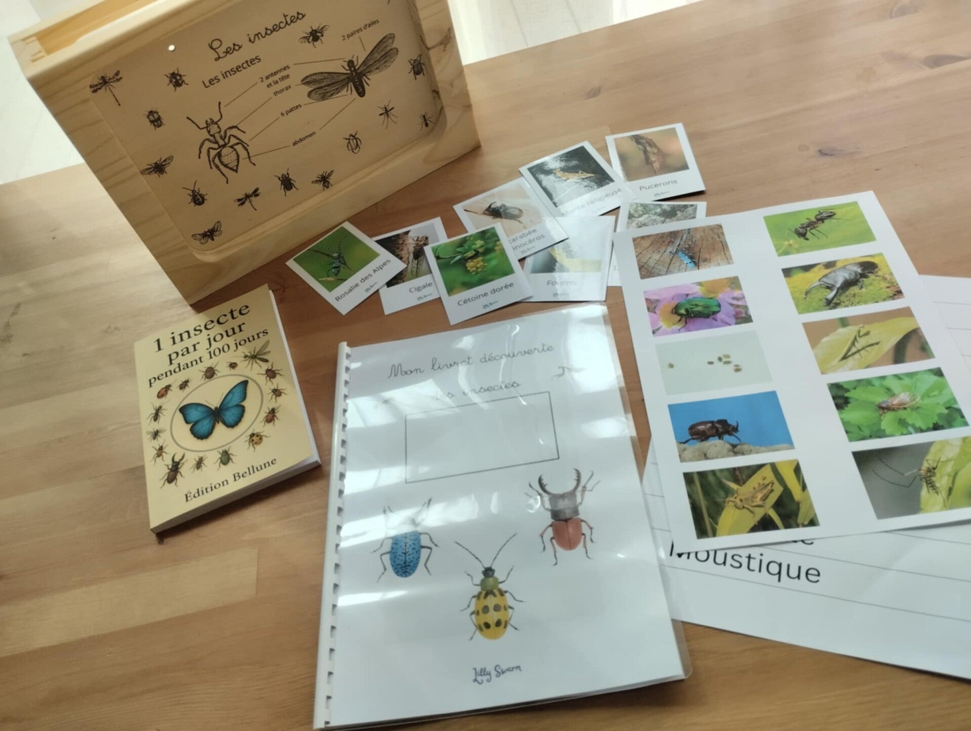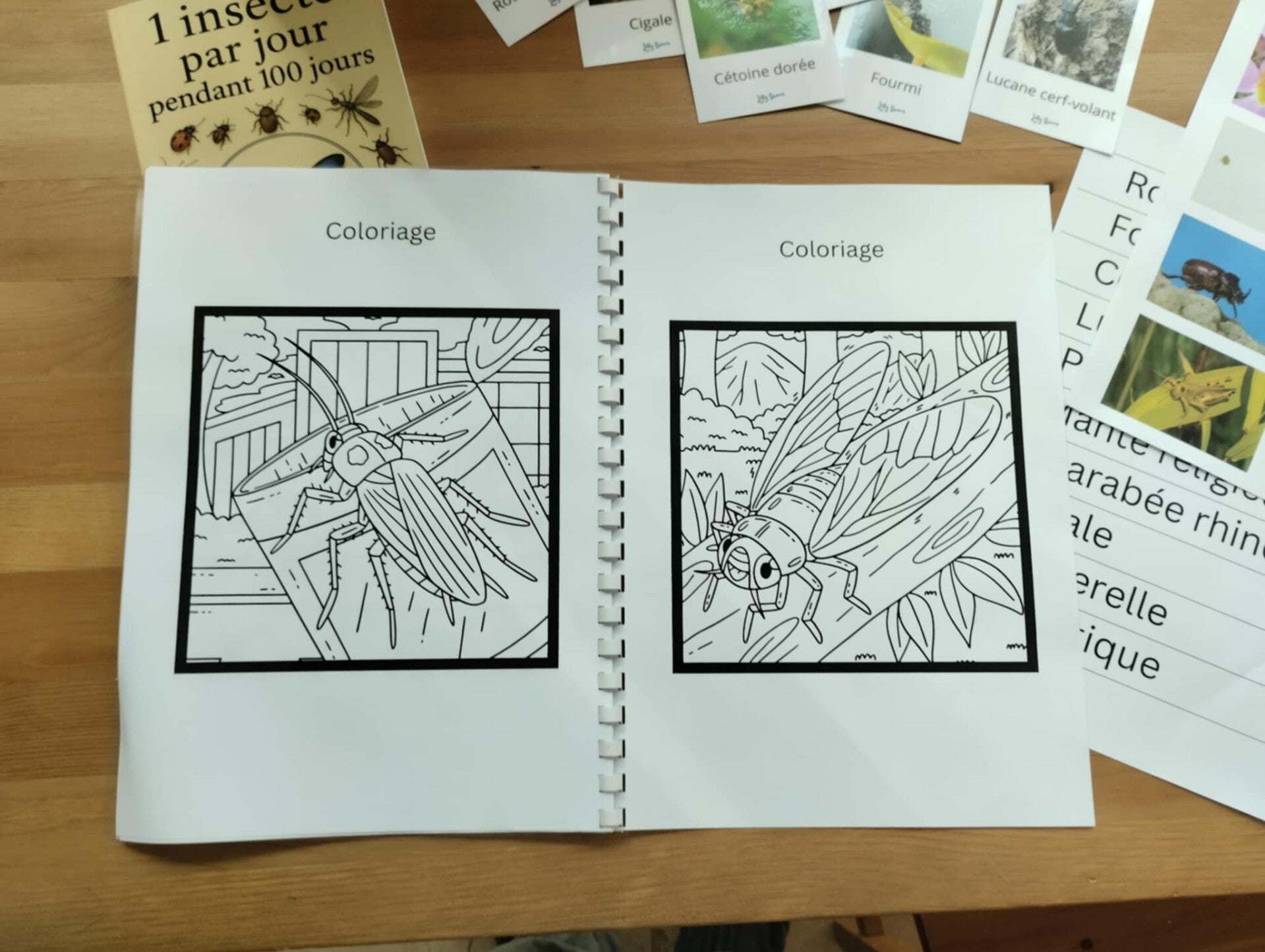 Page de droite: dessin réaliste et nom en cursive, possibilité de faire des fèches sur le dessin pour nommer les différentes parties du corps (abdomen, thorax, ailes...) et place pour coller photo et nom de l'insecte (photos et étiquettes disponibles en fin de livret, à faire découper et coller par l'enfant)
