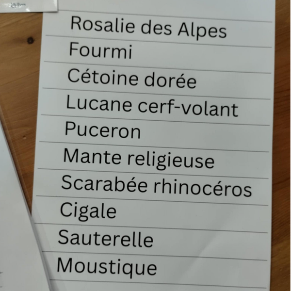 Rosalie de Alpes, fourmi, cétoine dorée, lucane cerf-volant, puceron, mante religieuse, scarabée rhinocéros,cigale, sauterelle et moustique.