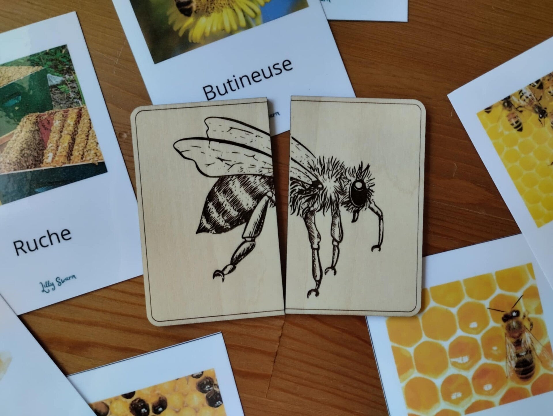 En photo avec l'affiche bois sur le thème de l'abeille.