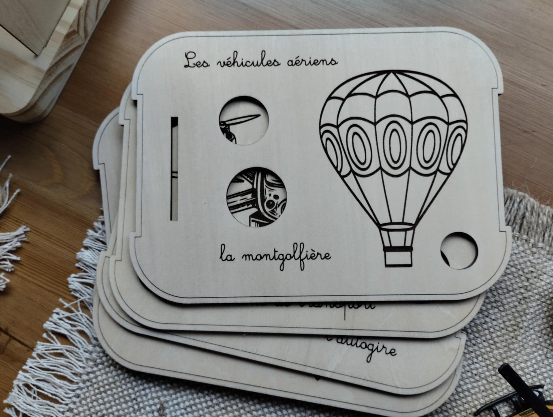 Voici la série des moyens de transports aériens, avec l'avion de ligne, l'hélicoptère ou encore la montgolfière. Six planches au total.
