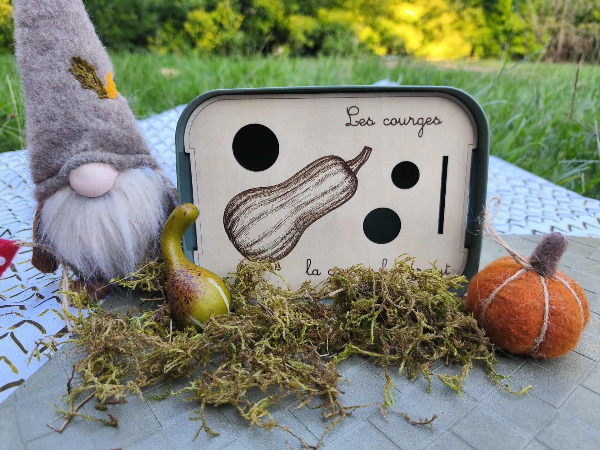 Huit cartes de nomenclature en bois sur le thème de l'automne: 4 courges et 4 champignons.