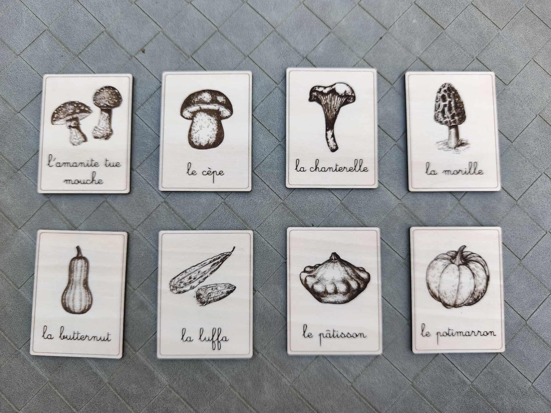Huit cartes de nomenclature en bois sur le thème de l'automne: 4 courges et 4 champignons.