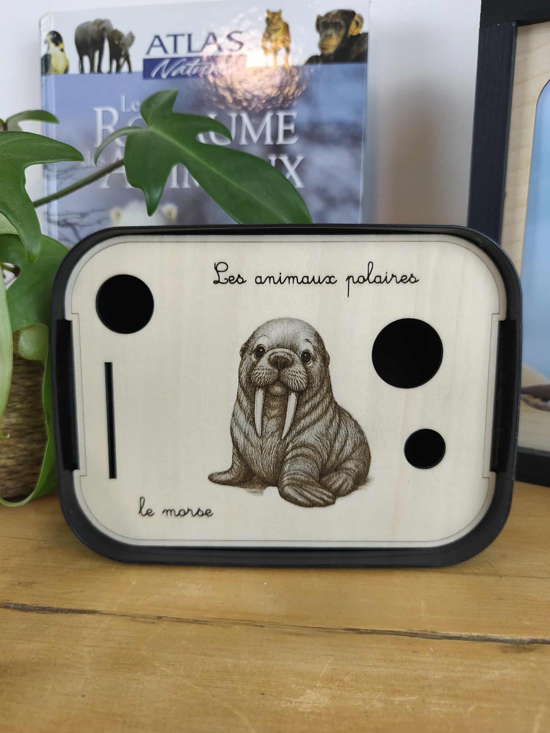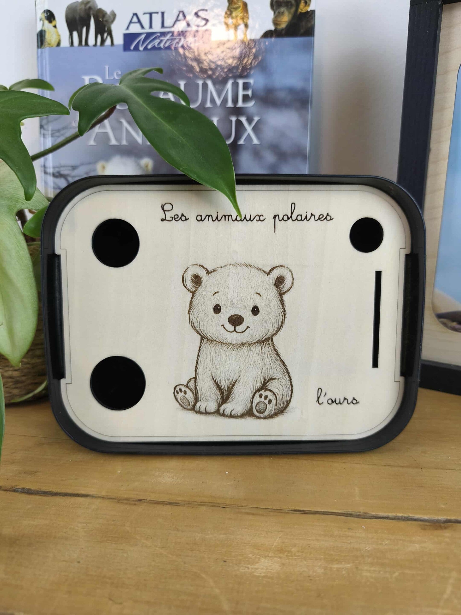 Une planche de huit cases sur le thème des animaux polaires enfantins, avec huit jetons.