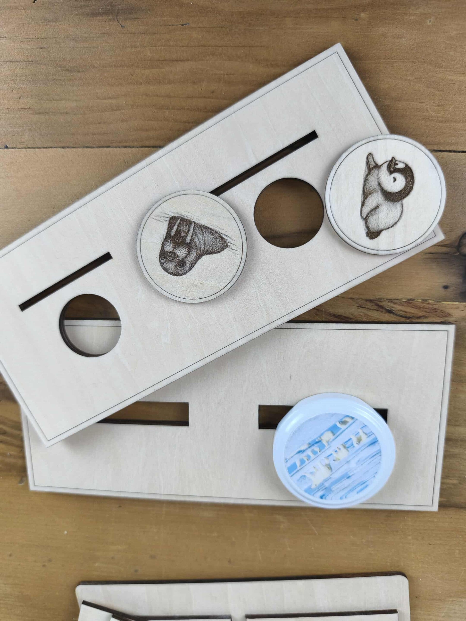 Le fond se compose de deux compartiments prévus pour accueillir n'importe quelle carte de nomenclature de l'atelier (chiffres, lettres, animaux et autres éléments)