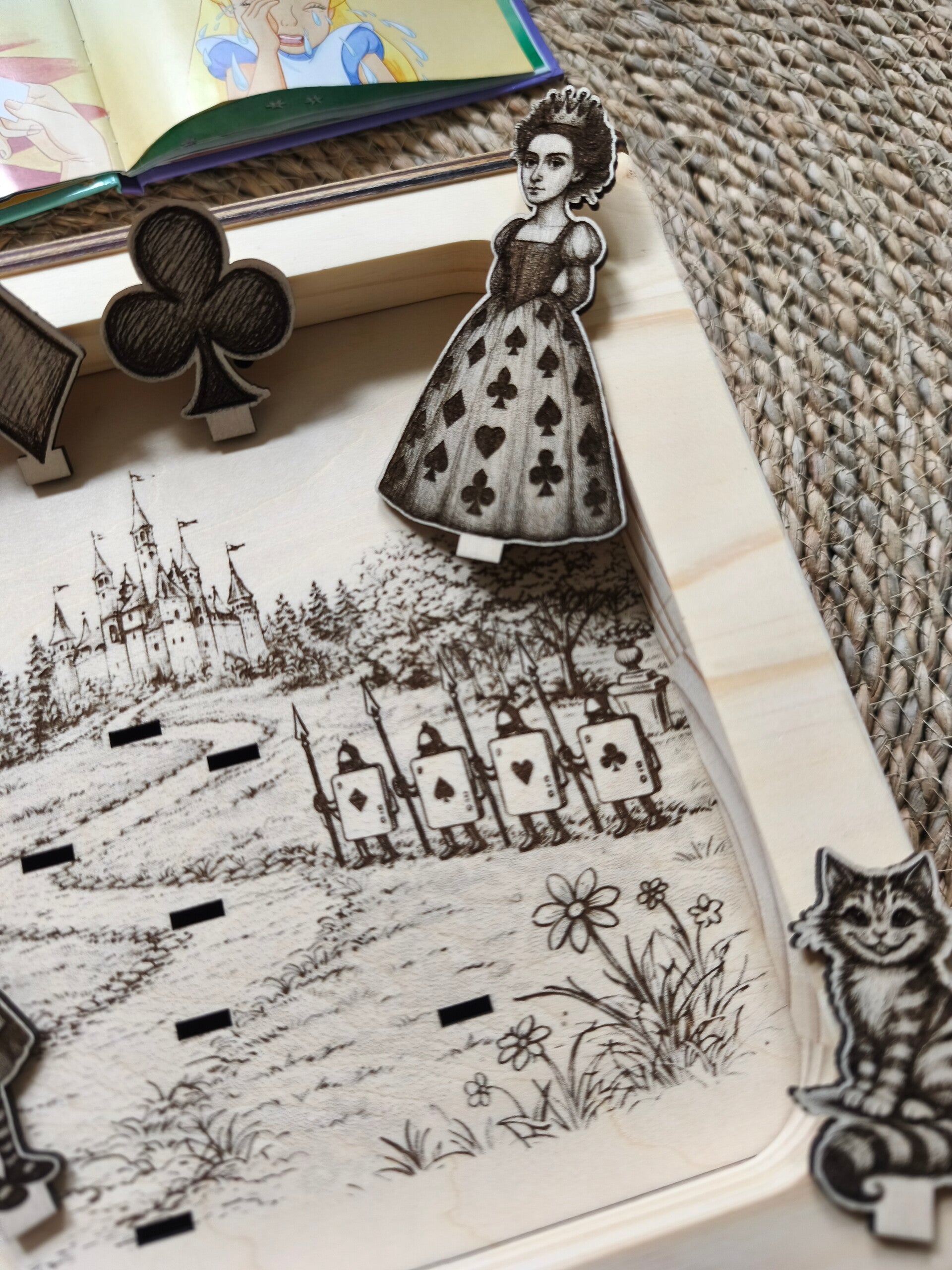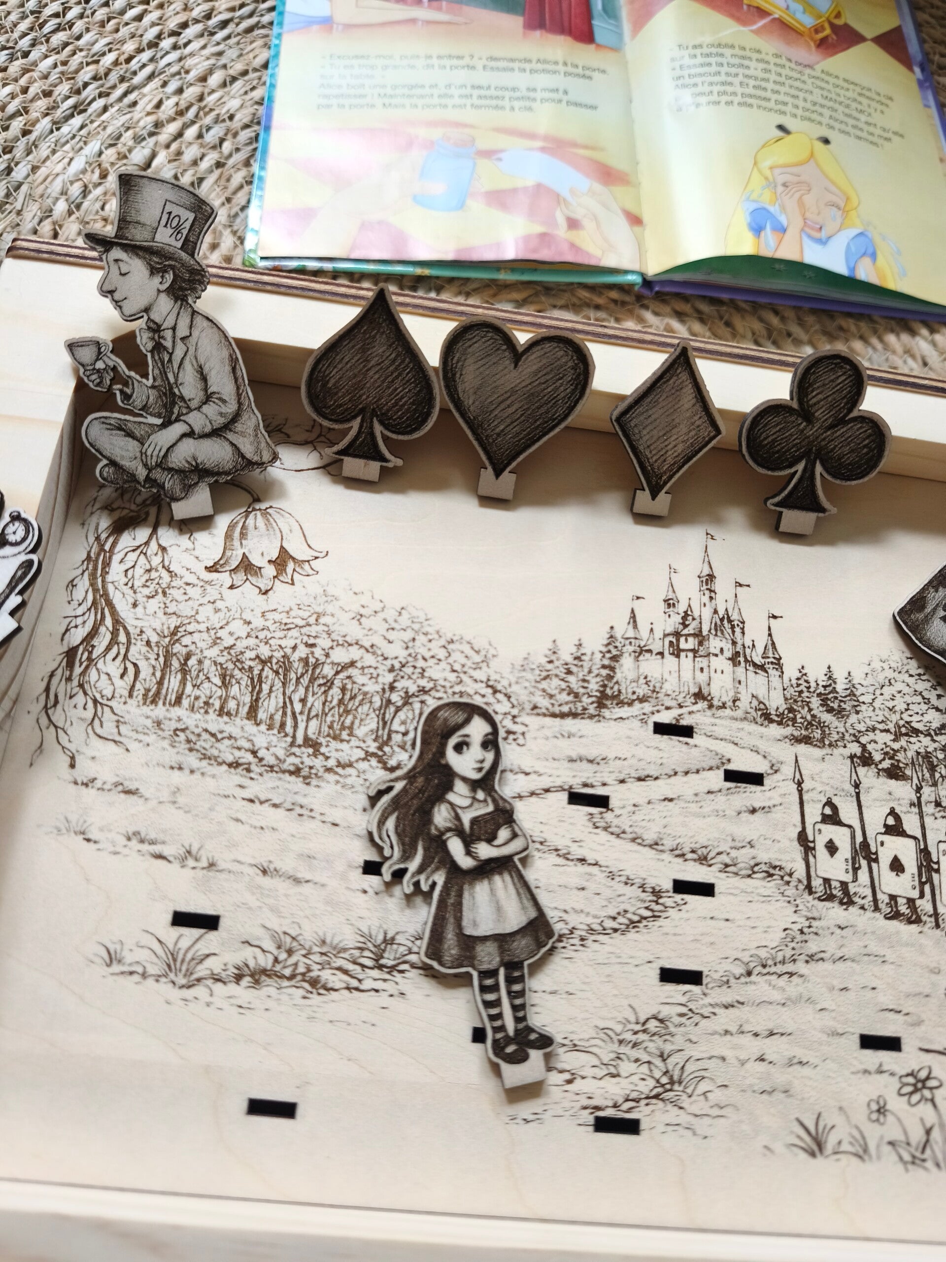 Planche pédagogique adaptée à la station d'observation A4, avec éléments à positionner dessus pour un effet 3D, thème contes: Alice au pays des merveilles.