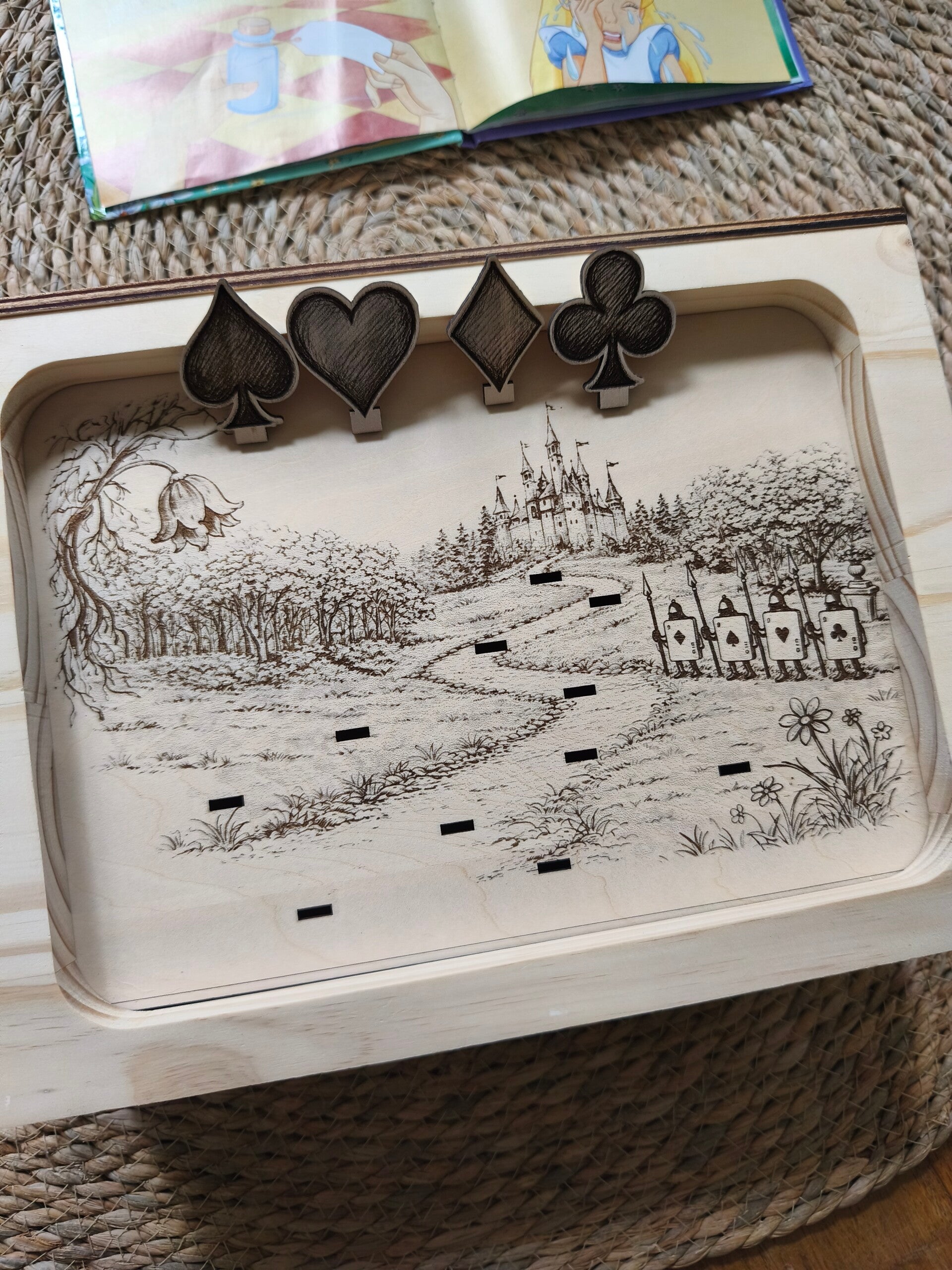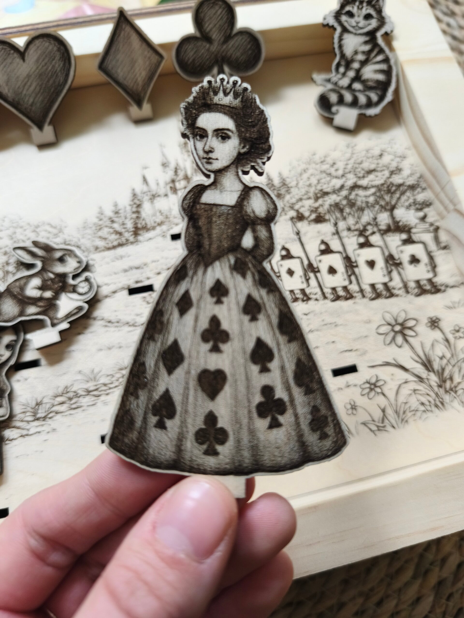 Éléments encastrables: Alice, le lapin, le chapelier fou, la reine, le pique le cœur le carreau et le trèfle, le chat.