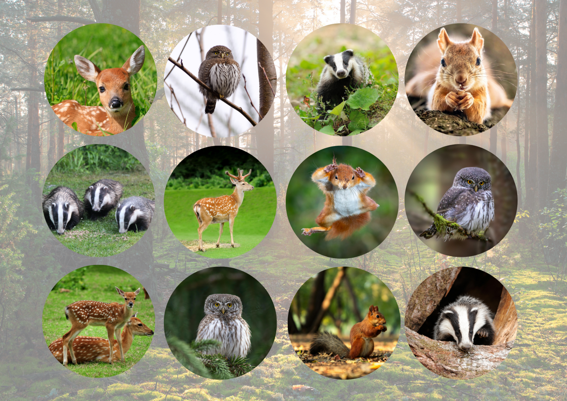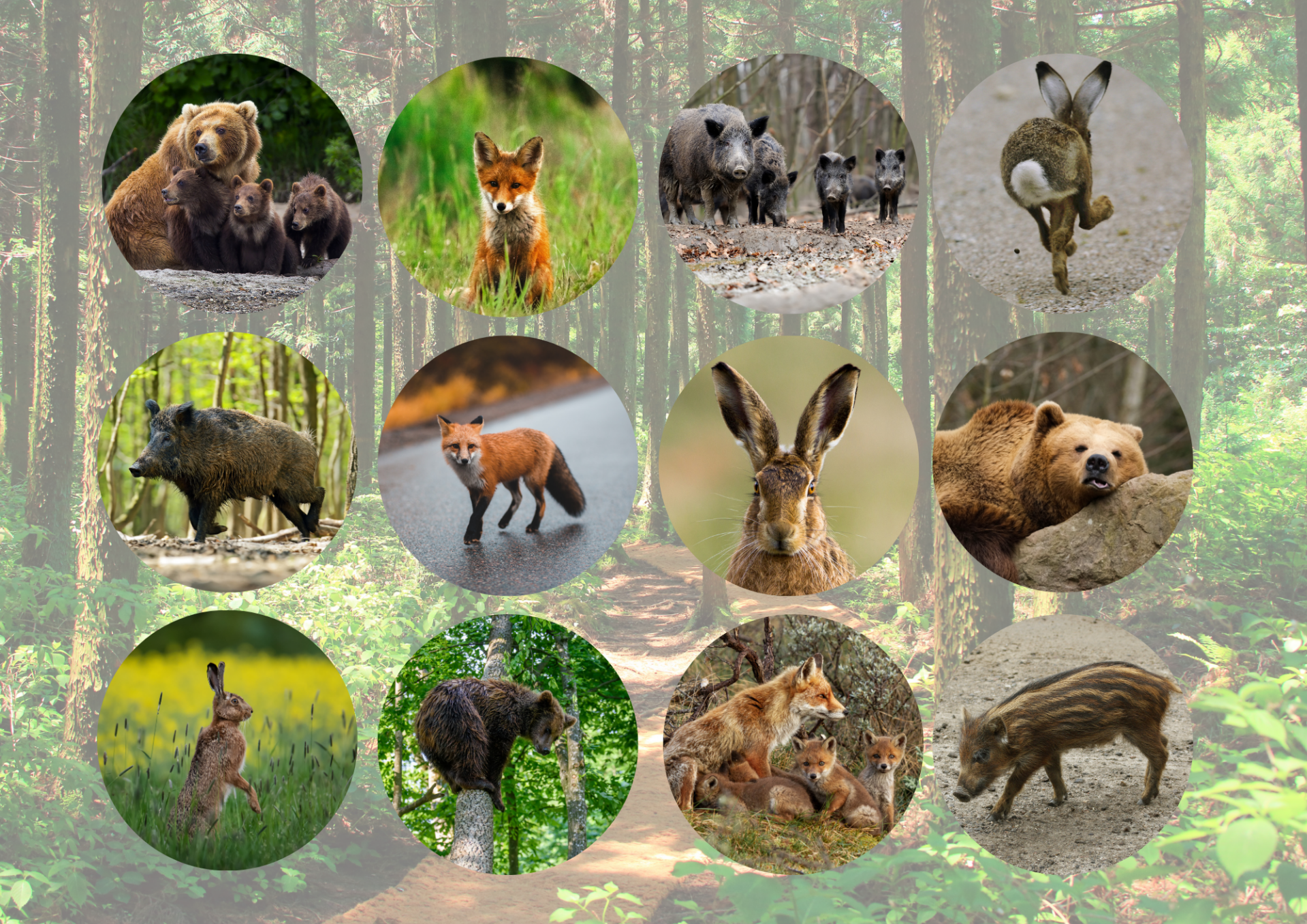 Blaireau - Chevêtte d'Europe - Daim - Ecureuil - Lièvre - Ours brun - Renard - Sanglier