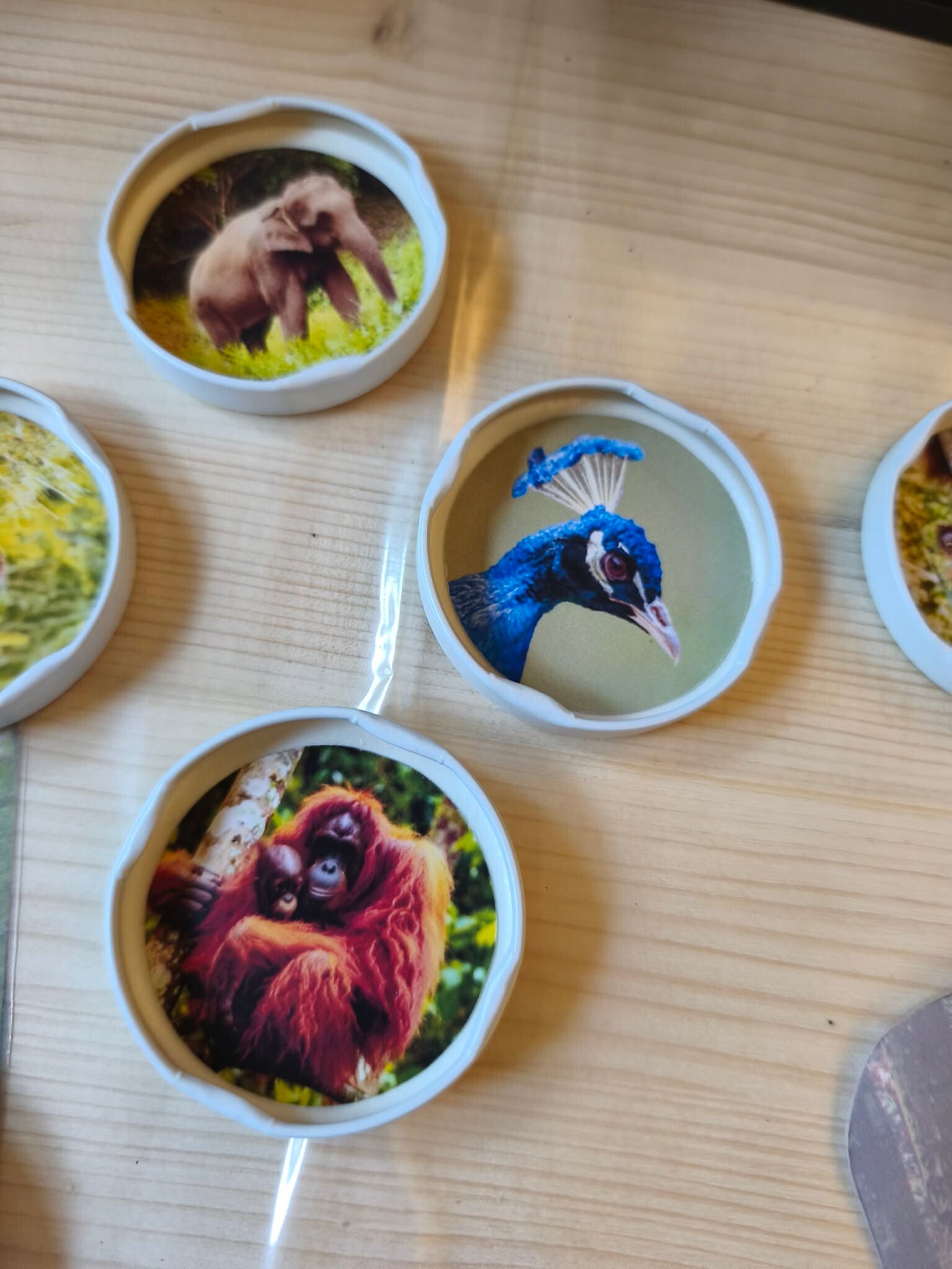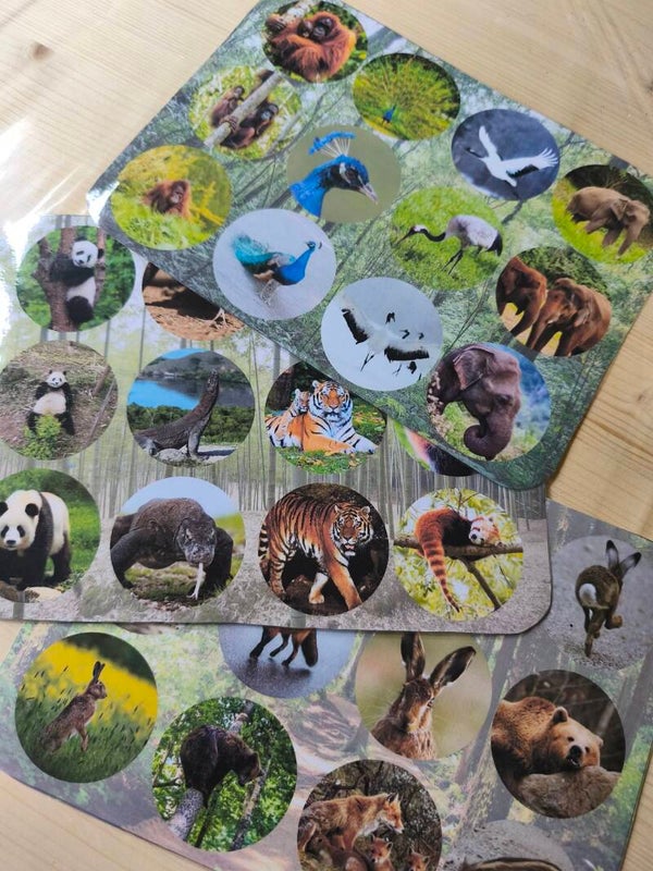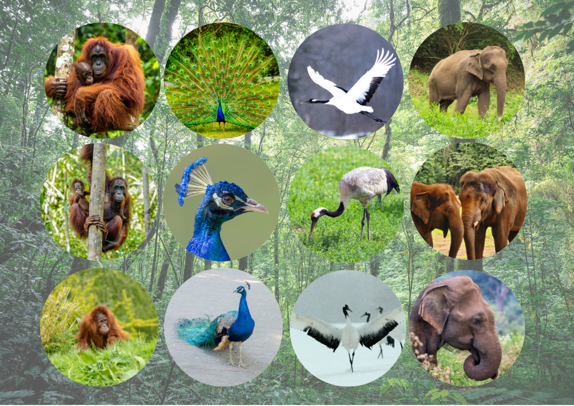 Le panda géant, le panda roux, l'éléphant d'Asie, le tigre du Bengale, l'orang outan, la paon, la grue du Japon et le dragon de komodo.
