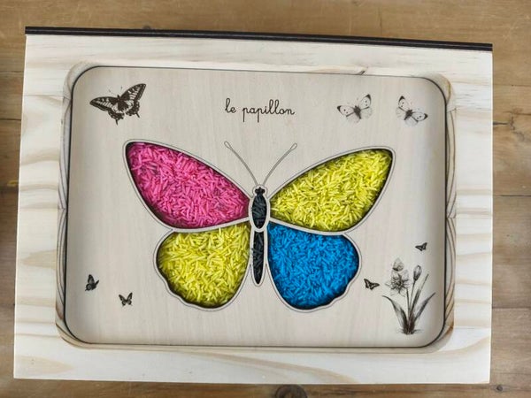 Tablette sur le thème du papillon, à remplir de sable ou de riz par exemple.