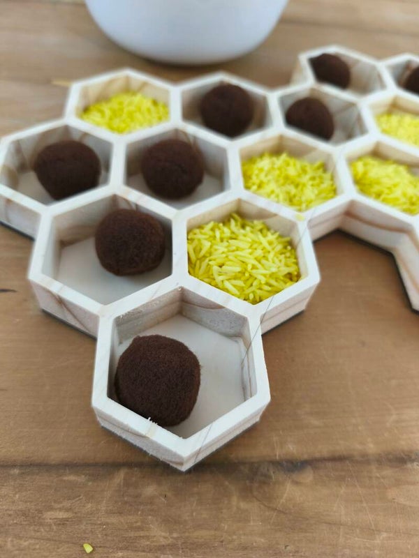 Plateau de motricité qui permet à l'enfant d'affiner son geste (en versant du riz coloré par exemple), mais qui peut également être utilisé pour aborder des notions scolaire comme les mathématiques (correspondance terme à terme): l'enfant doit mettre un pompon ou autre objet par alvéole.