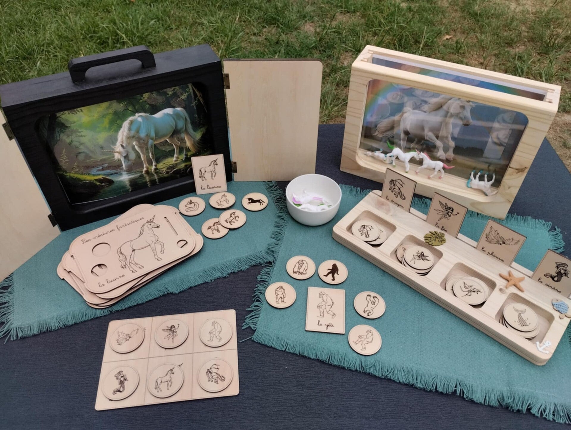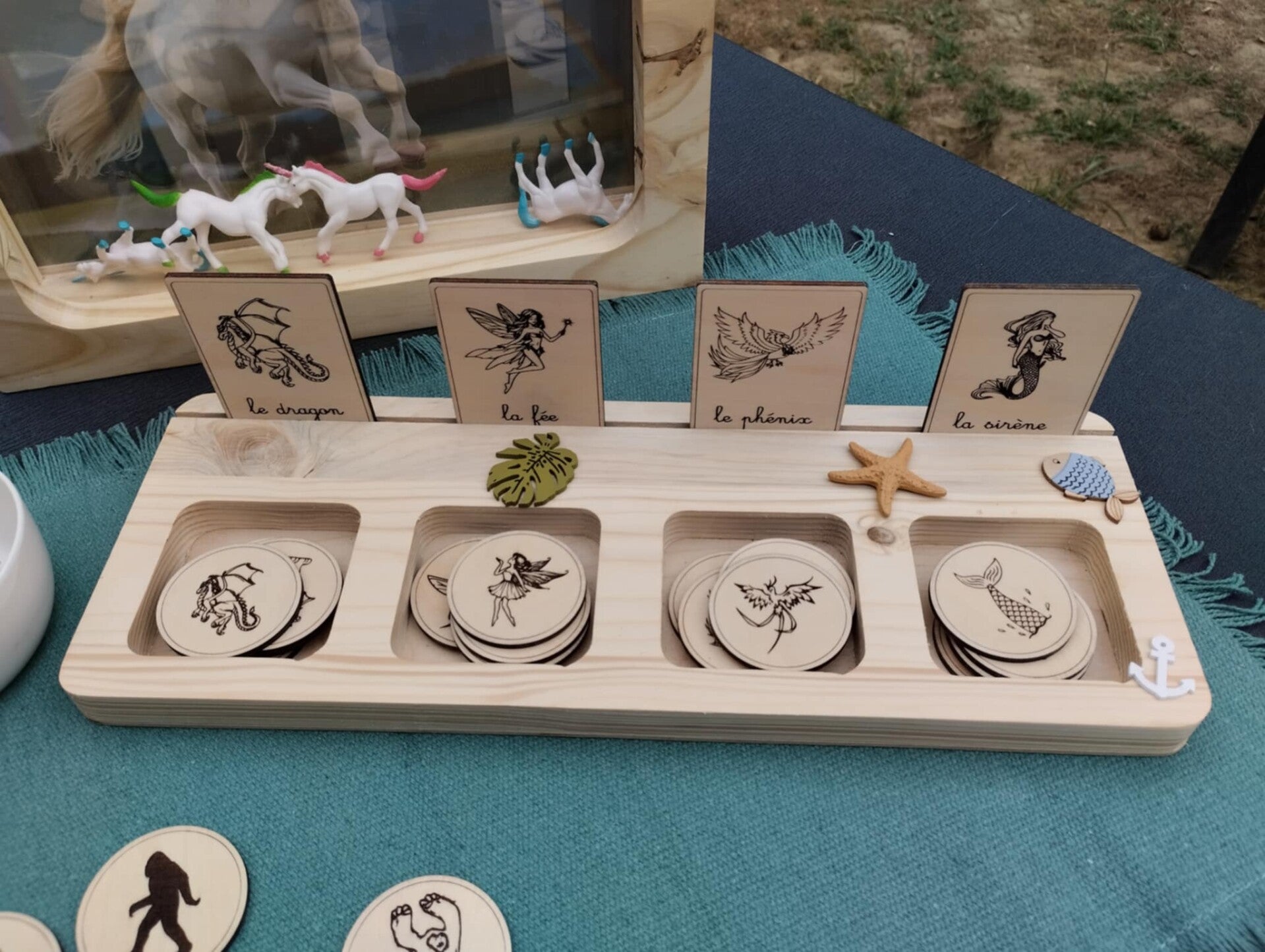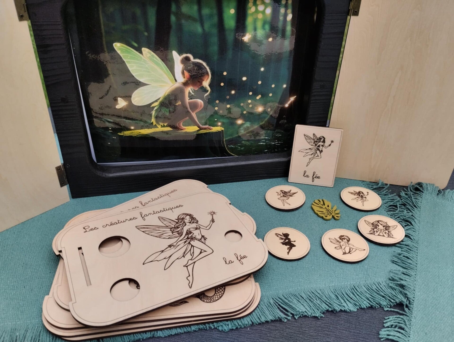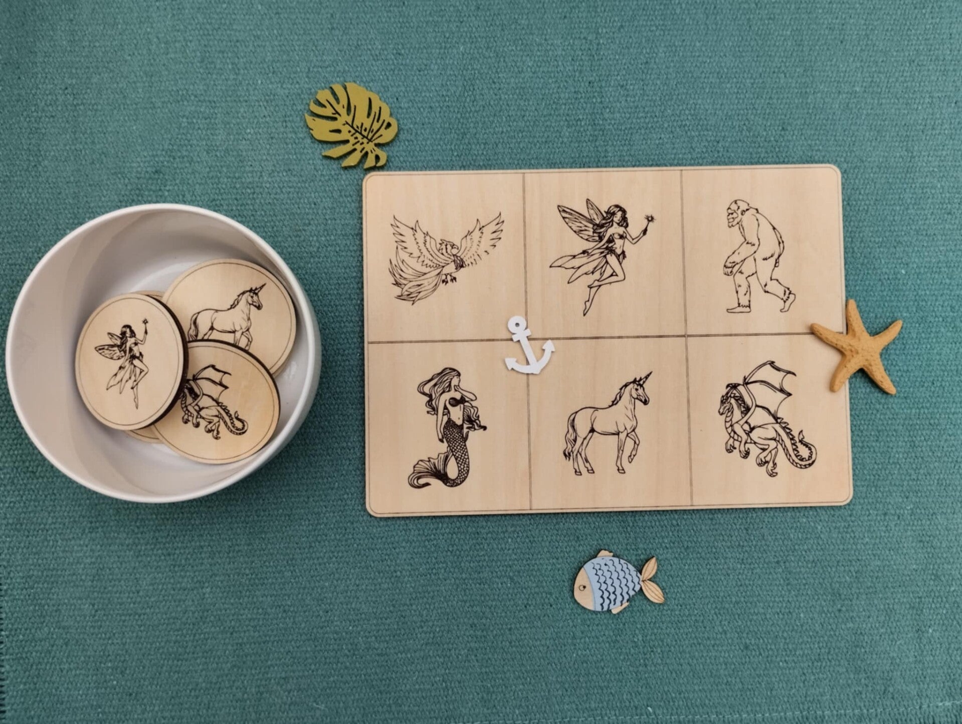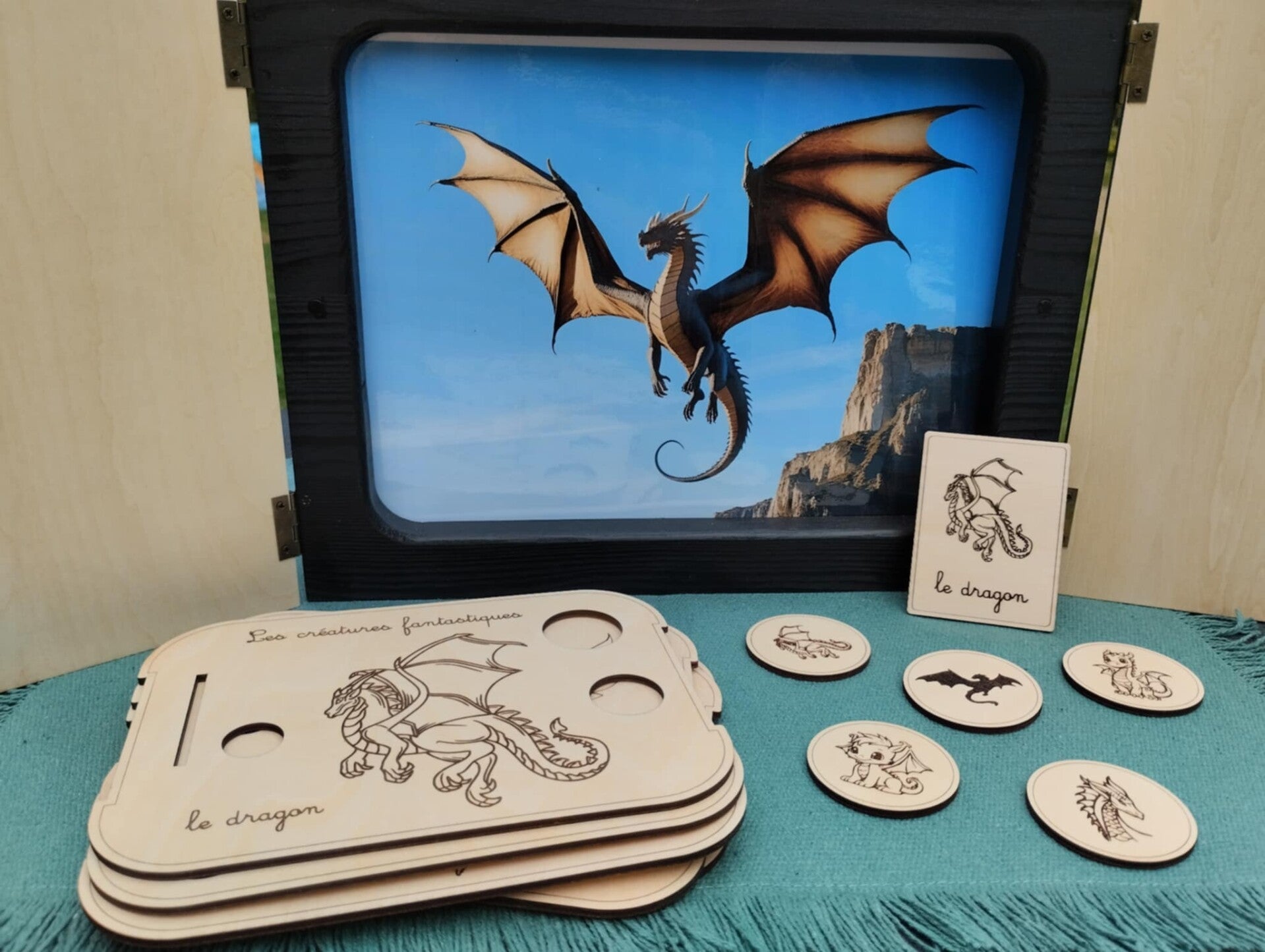 Six cartes de nomenclature bois sur le thème des créatures fantastiques. Mini livv et jetons assortis disponibles sur la boutique.